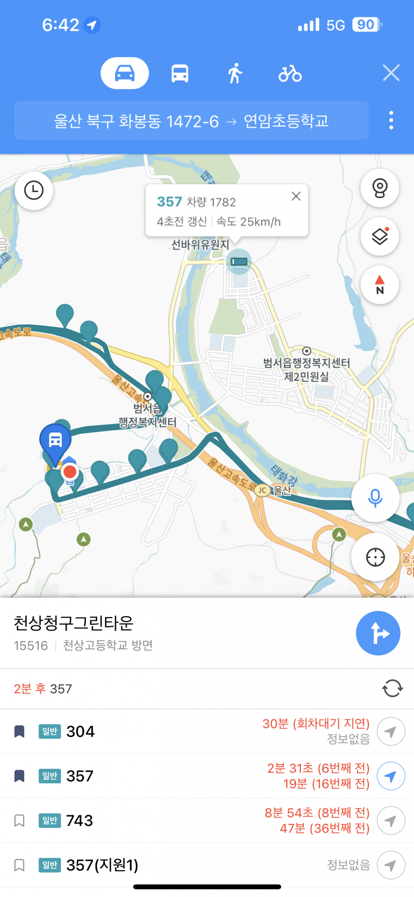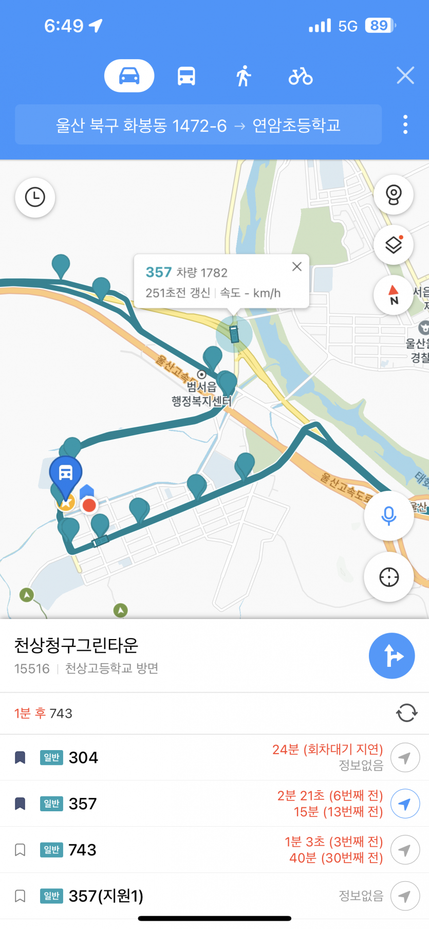 천상 청구그린 타운 정류장에서 357번을 기다리고 있었고