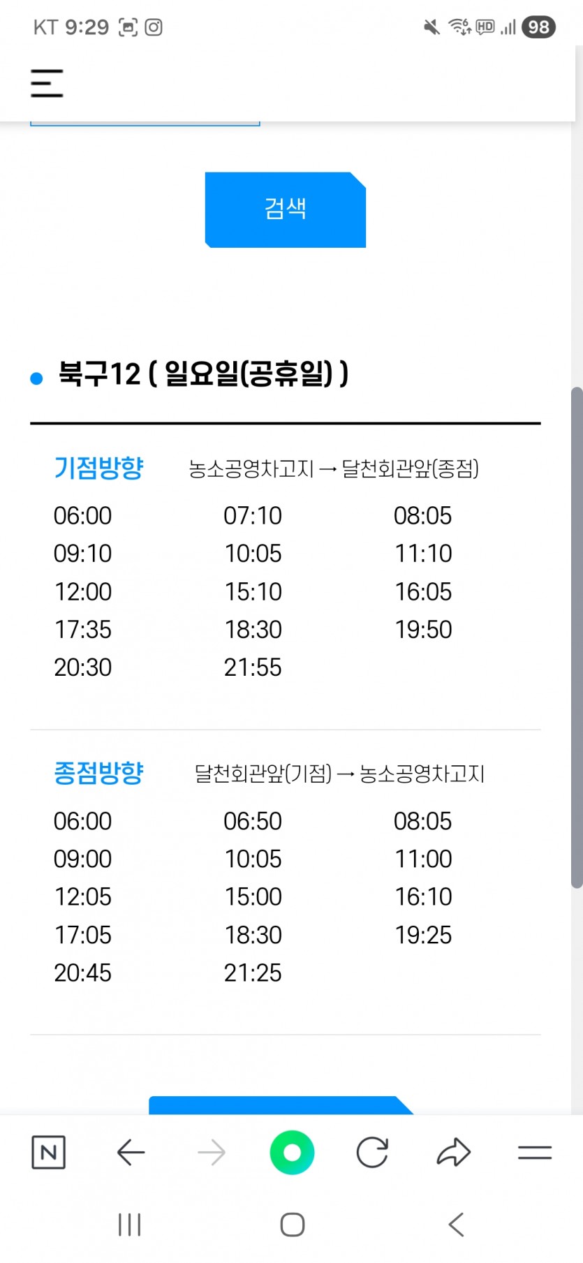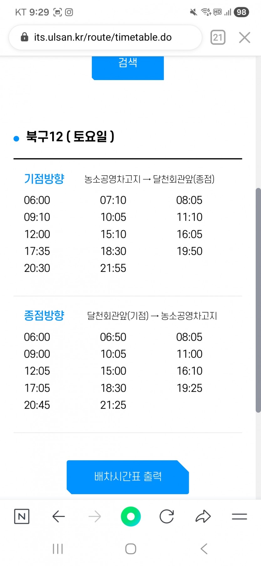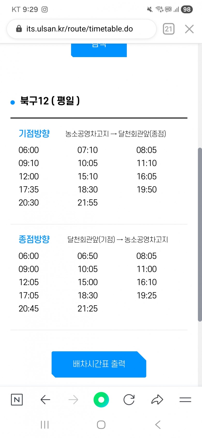 현재 북구12(달천->농소)를 자주 이용하고 있는 한 청년입니다. 한달전까지만 해도 잘 타고 다녔었는데 다른시간대는 모르겠으나 몇주전부터 09시에 출발해야하는 버스가 아예 오지 않는 문제가 발생하였습니다. 제가 그럴때마다 버스시간표 배차표 다 찾아봤는데 시간 바뀐거 없고 평일 토요일 일요일 다 그대로 운행 한다고 나와있더라고요. 그리고 버스전광판에도 북구12 운행이 제대로 뜨지 않습니다. 그냥 기다리고 있다가 오면 타고 안오면 못타고 아침에 일이 있는 저 뿐만이 아닌 다른 사람들도 분명 피해를 보고 있을거라고 생각합니다. 기억나는 버스 타지 못한것만 벌써 3번째입니다. 왜 이런 상황이 일어나는지 꼭 알려주시고 개선해주십시오.