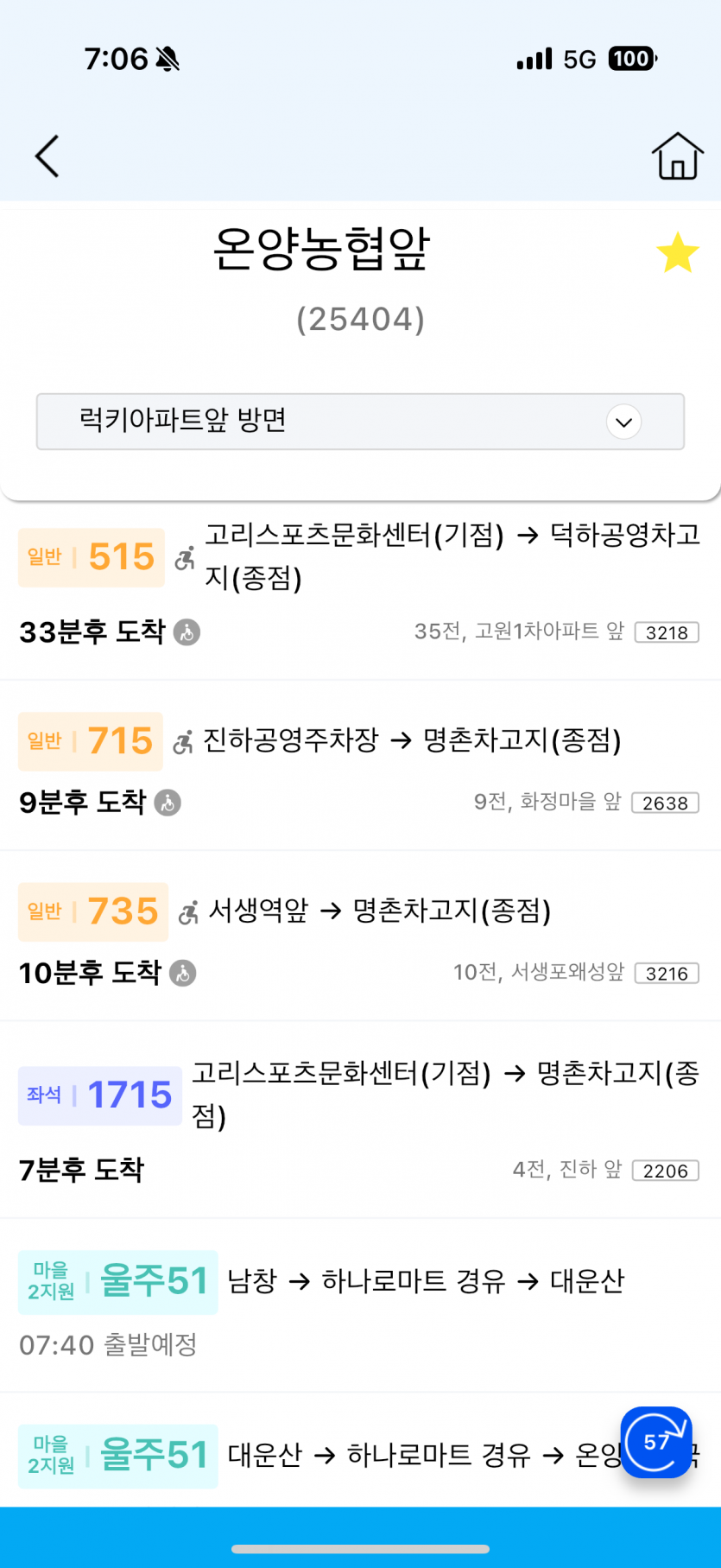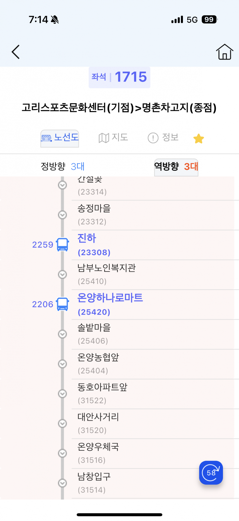 26.1.15일 오전 6시44분쯤, 송정에서 15분뒤에 온양농협앞으로 온다는 1715버스가 7시 20분 넘어서 온다는게 말이 되나요? 735번,415번 버스도 안오고 멈춰있었어요. 30분째 7분 뒤 도착으로 나오고, 진하앞에서 움직이지를 않던데, 그 거리를 40분이나 걸린다는게 참,, 말이 안되죠. 출근시간때에 아무 공지도 없이 늦으시면 안되죠.