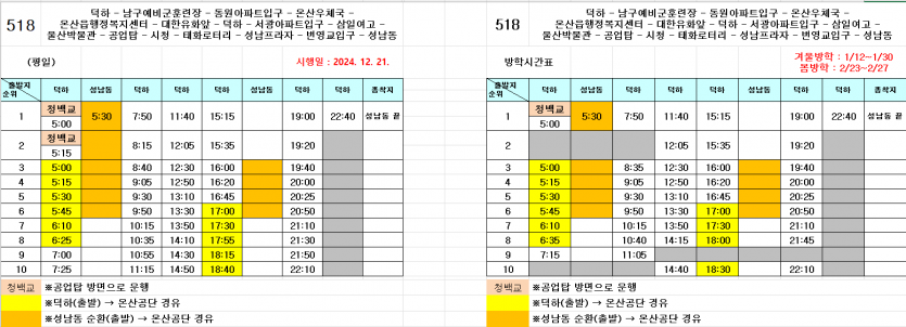 작성하신 내용과 관련하여 방학 이전 본시간표와 방학 시간표를 비교하였을 때 2코스 차량이 빠졌고, 어떤 기준으로 뺀 것인지는 운행회사에 문의해 보아야 합니다.