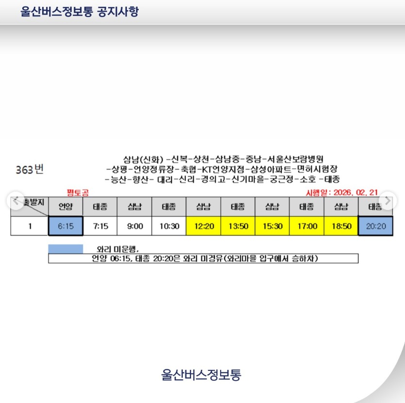 - 다음글Re: 울산여객 363번 노선 삼남출발 19시 막차 10분 단축 즉각 철회 바랍니다 26.02.20