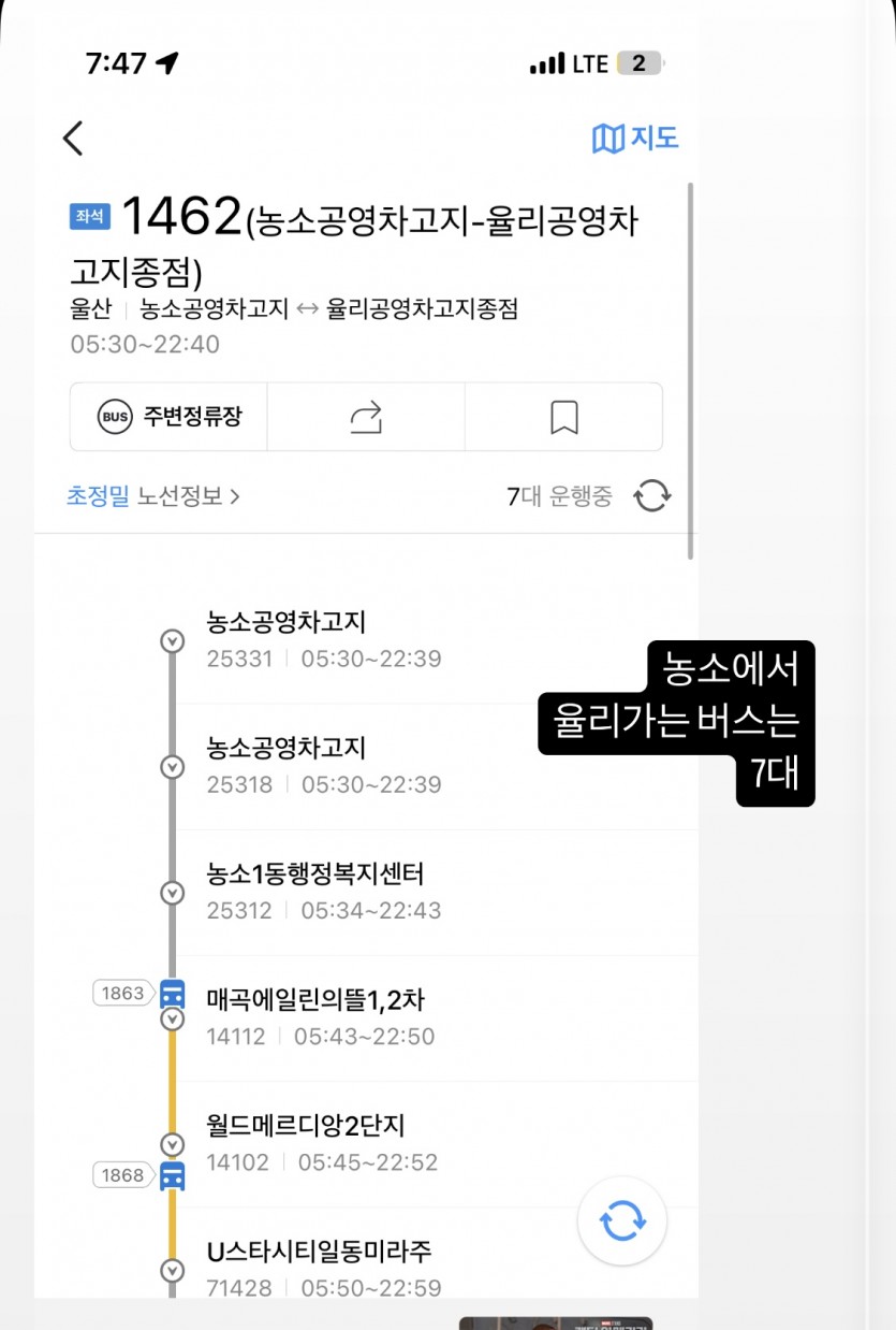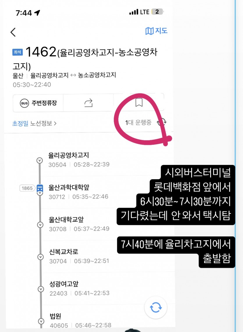 그러고 7시40분에 율리차고지에서 버스가 출발함