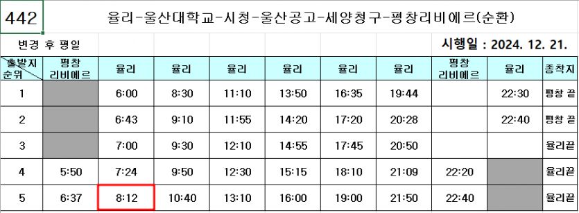 1. 442번 출발 시간은 율리 출발 시간에서 3~5분 정도 더하시면 됩니다.