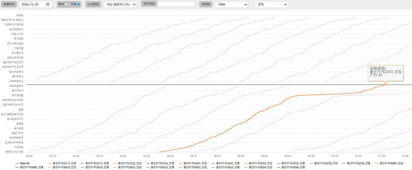 원래는 07:20 차량이 있어야 하는 것이 맞으나, 모화에 차량이 늦게 도착하여 늦게 출발한 것으로 확인되었습니다.