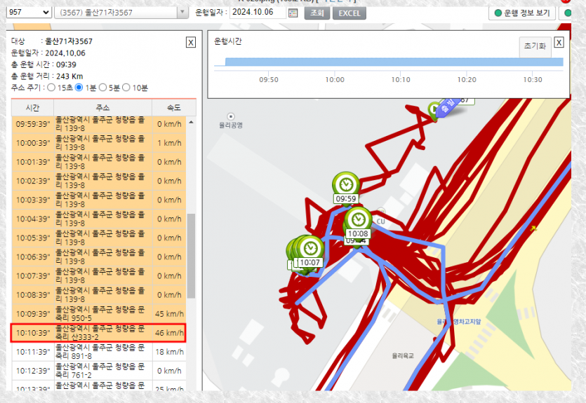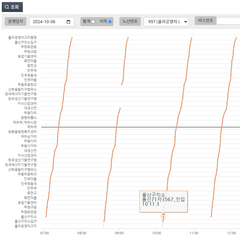 해당 기록 첨부드리오니 참고하시기 바랍니다.(들르지 않은 구간이 있다면 그래프가 끊겨서 표출됩니다.)