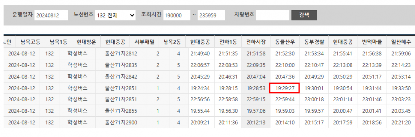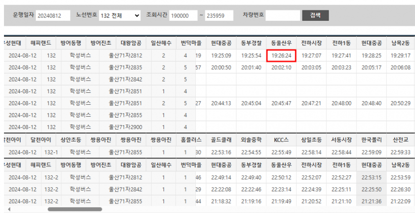 작성하신 내용을 바탕으로 운행기록을 조회해 본 결과, 19:26 경 전하시장 방향으로 지나간 2812호가 있고, 동부경찰서 방향으로 지나간 2851호가 있음을 확인하였습니다.