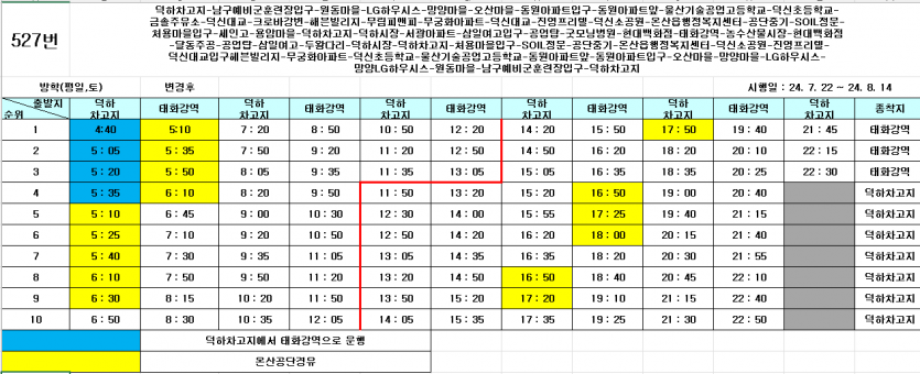 현재 527번이 방학 감차 기간이기 때문에 태화강역에서 출발하는 시간은 21:15 다음에 21:40 시간이 있습니다.