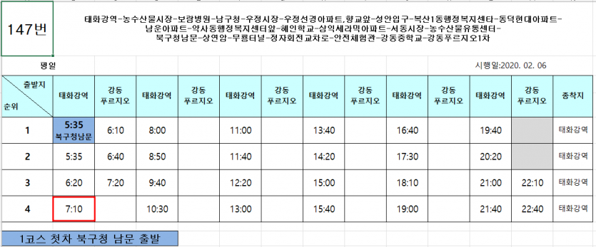 태화강역에서 출발하여 강동 푸르지오1차를 회차하여 다시 태화강역으로 돌아가는데, 문제는 이용하시는 시간대가 강동에서 출발하는 시간이 고정되어 있지 않습니다.