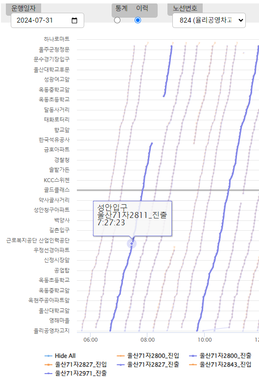 운행기록을 살펴본 결과, 해당 시간대를 운행한 2811호가 성안입구에 07:27 경 도착하여 작성하신 07:30보다 늦지 않은 기록을 확인하였습니다.