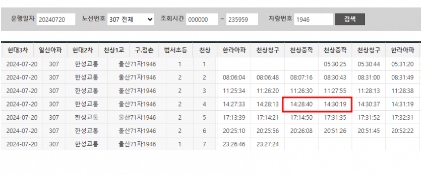 해당 1946호 차량이 천상중학교에 늦게 도착하여 화장실 및 휴게시간도 가지지 못하고 바로 돌아나온 사실을 확인하였습니다.