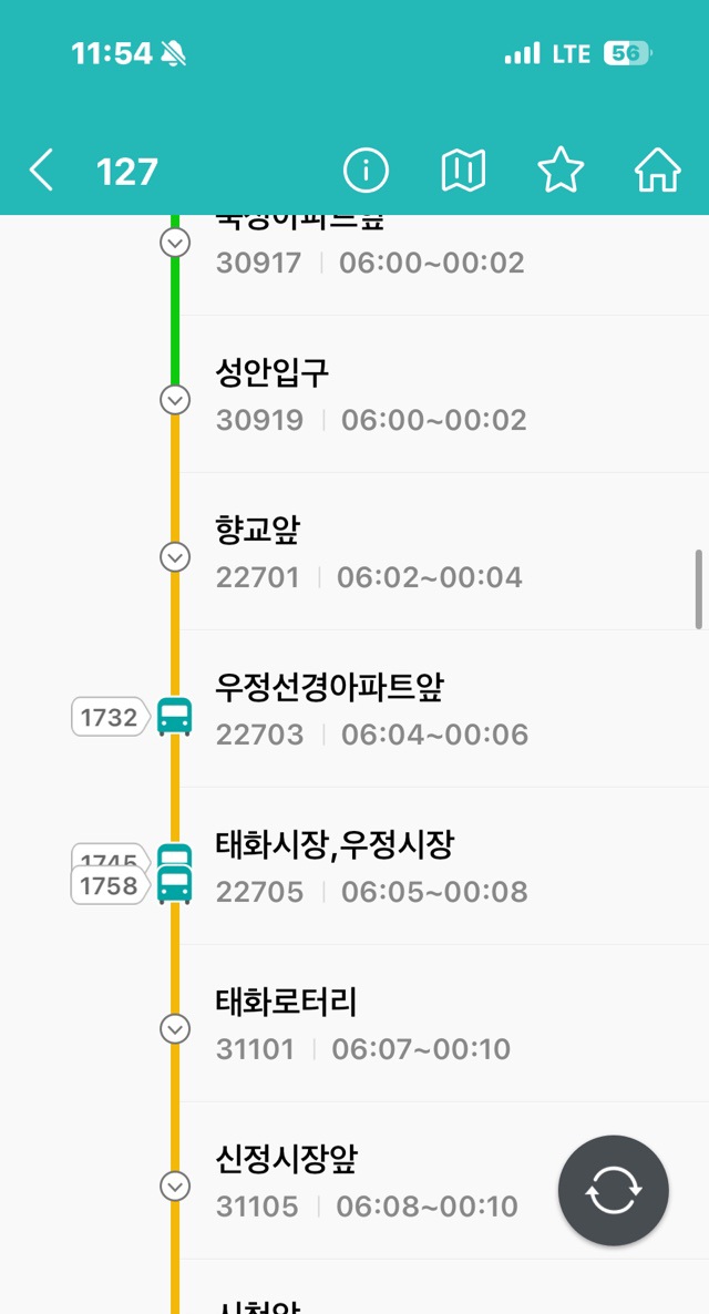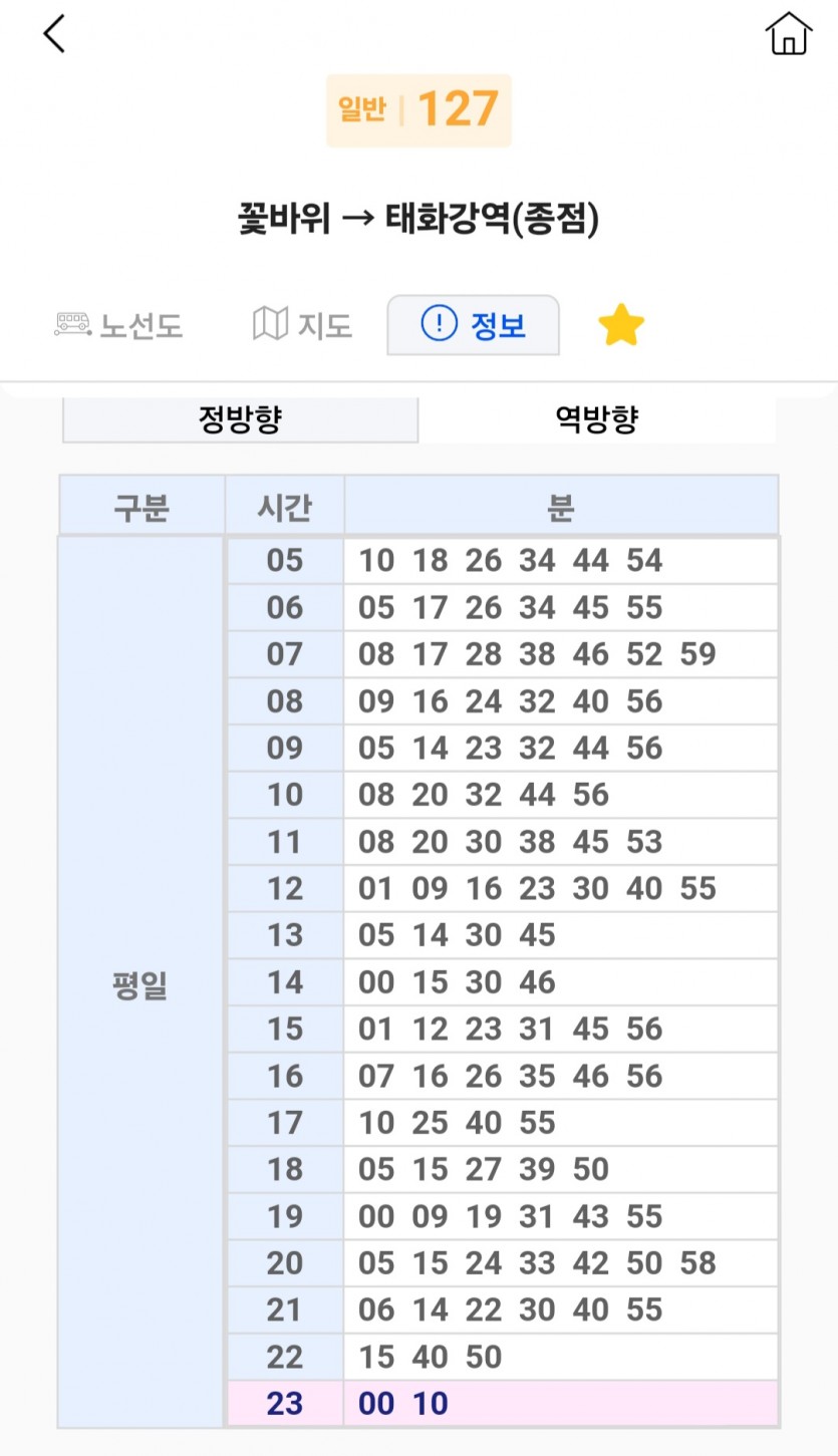 11시 54분에 도착했었고 차도 안막히는 시간에 막차 시간에 3대가 거의 동시에 오는건 문제있는거 아닌가요? 분명 3대 모두 10분 간격으로 차고지에서 나왔을텐데 막차가 꽃바위에서 44분만에 우정선경까지 도달합니까? 127번이 배차가 좋은편이라 차막히는 시간에 어쩔수 없이 이렇게 오는건 이해합니다만 막차시간에 이런건 아니라 봅니다 기사님들 퇴근본능인가요?