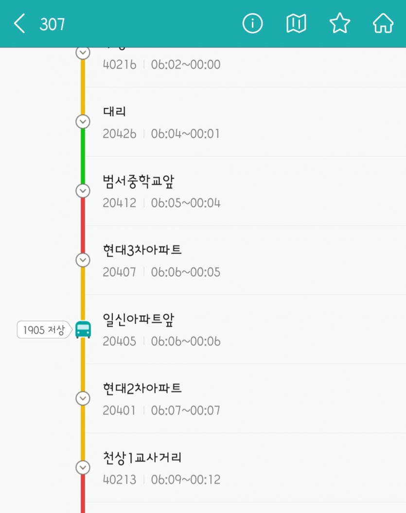 휴대폰 앱을통해 버스의 남은 시간을 확인하고 있었고 곧 도착한다는 것을 알고 정류장 앞으로 나갈때 버스가 다가오는 것을 보았습니다. (해당 버스는 307번 저상버스 차량번호 1905 입니다)