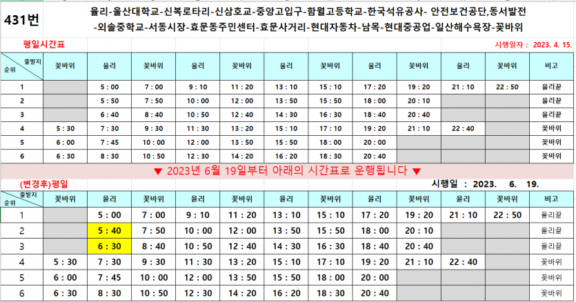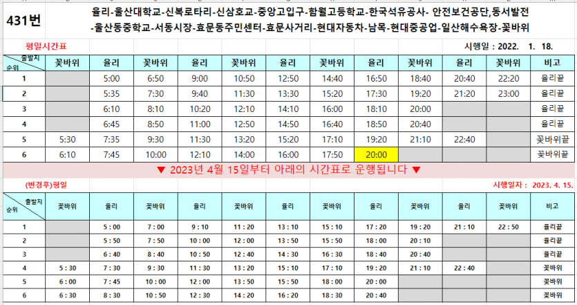 먼저 설명드릴 사항은, 해당 431번이 2022년 1월부터 시간을 당겨서 5분, 10분 2차례 시간을 앞당겼으며,