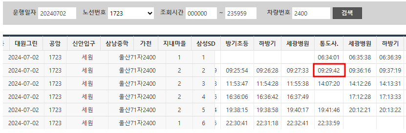 해당 날짜를 제외하고도 지속적으로 늦게 출발한 기록들을 확인하여 2024-07-08(월)에 세원 배차담당자와 유선연락으로 시간표 변경을 건의하도록 하겠습니다.