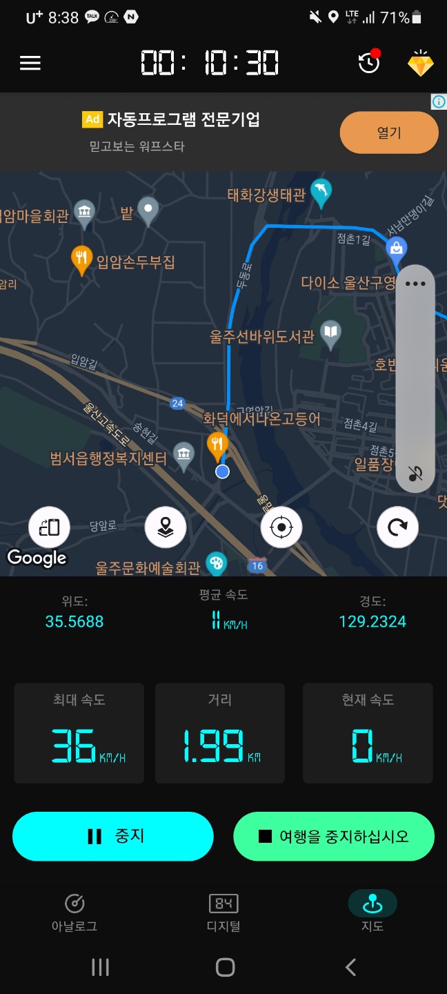 도심도 아니고, 골목길도 아닌데다가 80km 국도까지 있는데도 7km 거리를 25분동안 운행한다는건 말이 안됩니다. 이 버스는 안 가지만, 비슷한 거리대인 태화강역 ~ 롯데마트 구간도 아무리 혼잡해봐야 20분 이내로 돌파합니다. 두번째 사진 속도계 어플에 최고속도가 71km가 찍힌것도 진목에서 환승했던 3240호 버스였고, 환승하기 전까지는 80km도로에서도 358번 3286호는 40km정도 밖에 안 내서 같이 뒤따라오던 다른 버스와 뒷차량들한테까지 민폐 끼치면서 운행하였습니다.