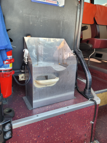 작성하신 내용과 관련하여 대우여객에 문의해 본 결과, 입구쪽 공간이 부족하여 거스름돈 나오는 공간을 빼내어 다른 쪽에 설치했다는 답변을 받았습니다.