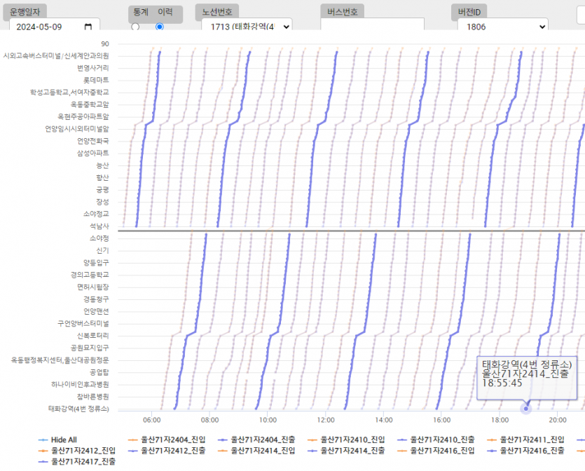운행기록을 살펴본 결과, 불편을 겪으신 날짜의 2414호 차량도 태화강역에 도착을 18:48 경 도착하여 휴게시간을 가지지 못하고 바로 돌아나온 것을 확인하였습니다.