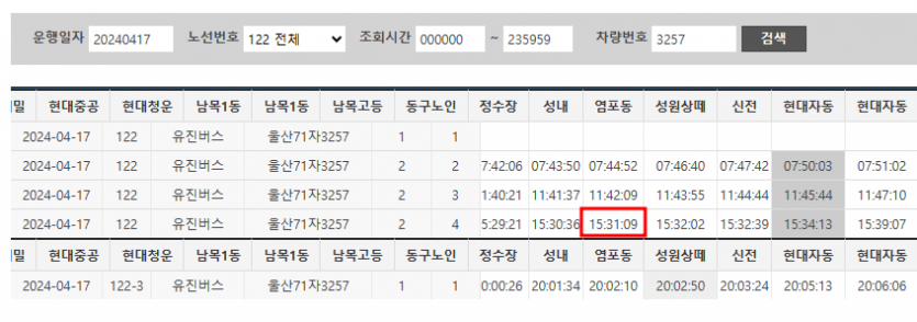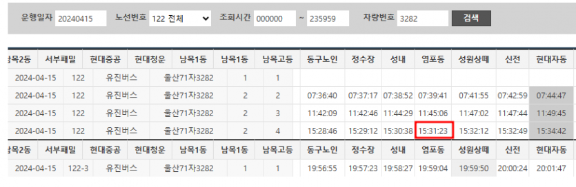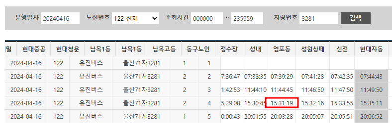 해당 변수를 생각하더라도 4/15~4/17까지 15:31 경 염포동에 지나가 요구하시는 시간과 1분 미만의 차이밖에 나지 않기 때문에