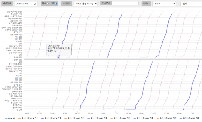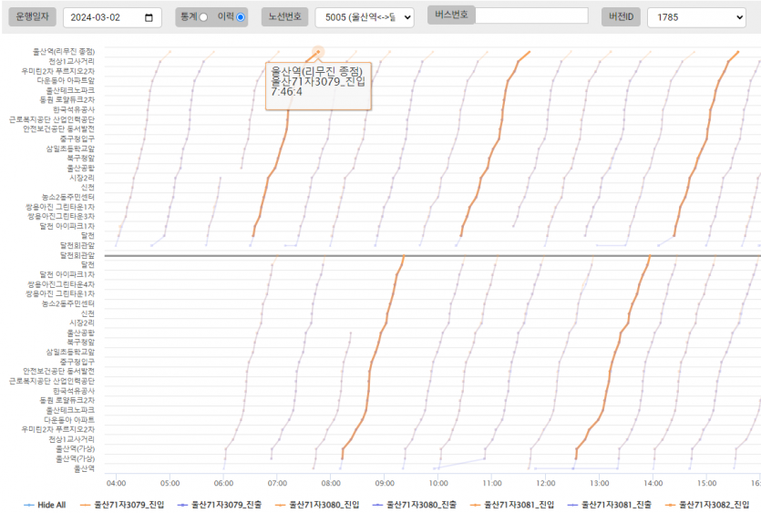 첨부해 드린 운행기록 그래프를 보았을 때 그래프 기울기가 완만하면 느린 것이고, 급할수록 빨리 간 것인데 다른 차량과 기울기의 차이가 거의 없는 것을 확인할 수 있습니다.