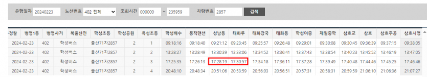 해당 내용과 관련하여 운행기록을 살펴본 결과, 태화루 정류장에 17:30 경 지나간 2857호 차량이 있음을 확인하였습니다.
