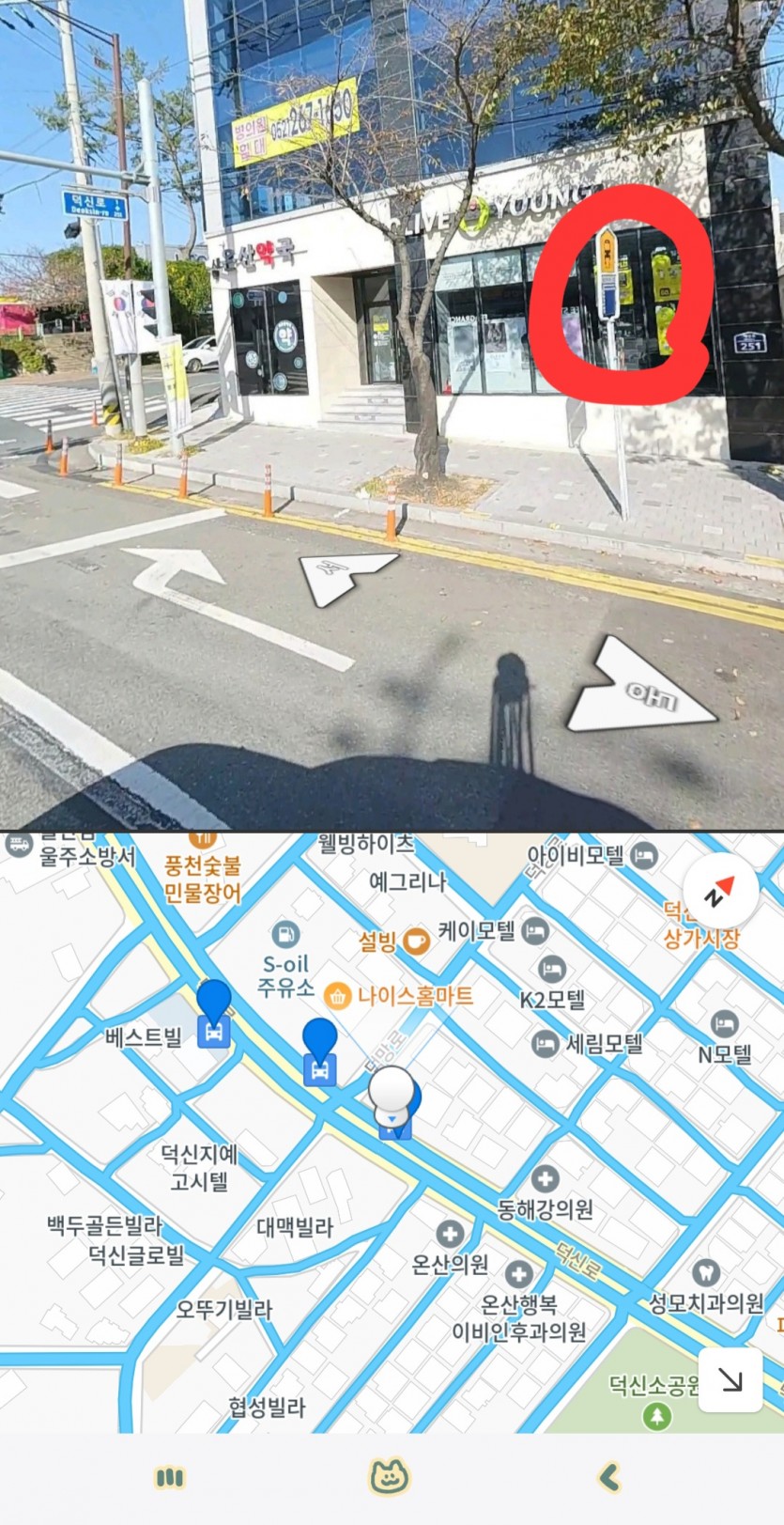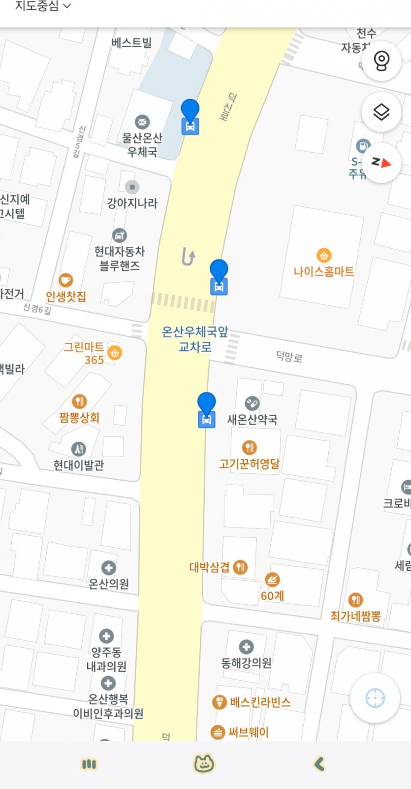 1번 사진에서 교차로 앞에있는 온산우체국 정류장이 51,52가 정차해야하는 곳이고 교차로 뒤에있는 정류장이 53번이 정차해야하는 곳으로 표시되어있습니다