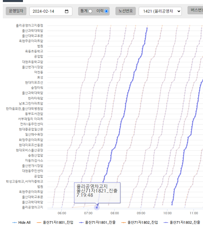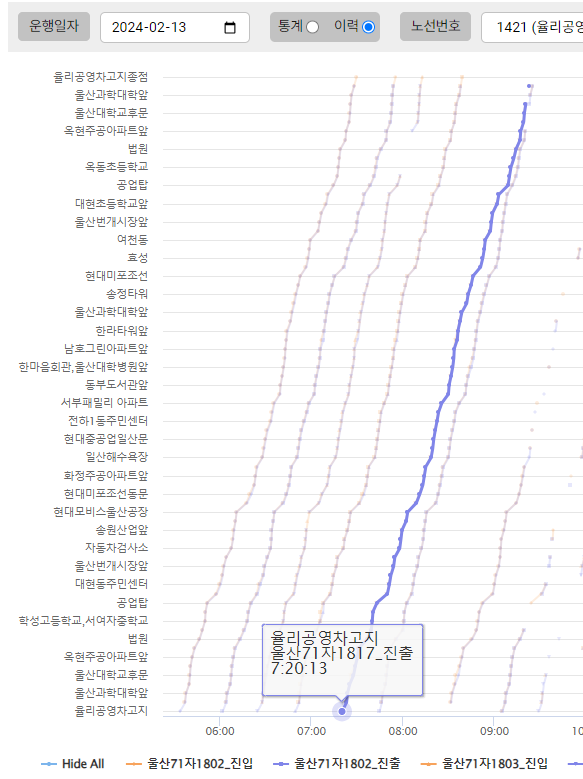 작성해 주신 내용과 관련하여 운행기록을 살펴본 결과, 글 남겨주신 2/15(목) 기준으로 차량 정상운행하였고 2/13(화) 운행도 정상적으로 출발한 것을 확인하였습니다.