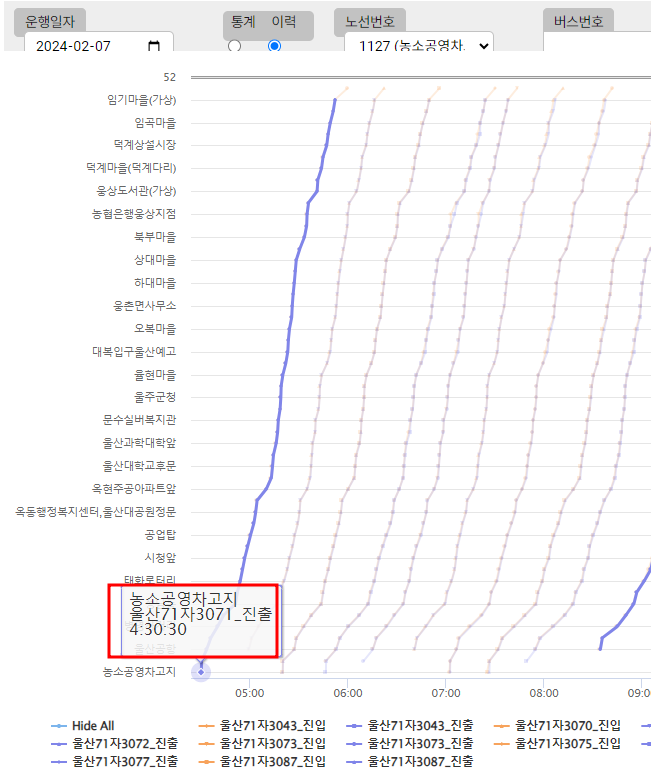 2/7(수) 1127 노선 첫차 04:30 농소차고지 출발 시간은 정확하게 지켜 출발했기 때문에 민원 사유로는 해당이 어려운 점 양해 부탁드립니다.