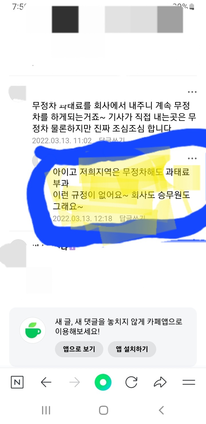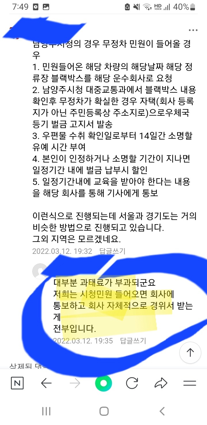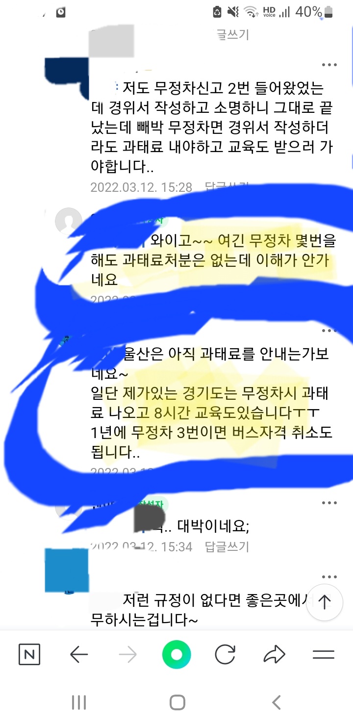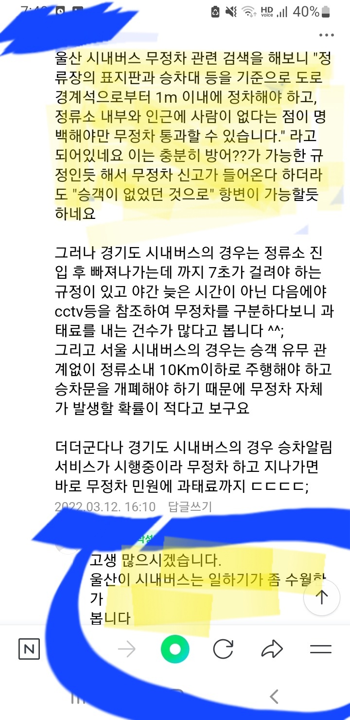 지인이 12월 말~1월초에 울산에 여행 겸 출장으로 대중교통을 이용하였는데 증거도 남겨 놓을 생각도 안 해서 버스번호랑 정류장 번호,방향은 모른다고 합니다. 그냥 하소연만 하더군요. 무정차가 많다고. 저도 대중교통을 심심치 않게 이용하고 무정차버스를 몇 번 보고 경험해도 신고 하지 않았는데 타지 사람이, 그것도 몇 년 만에 연락이 됐는데 이런 말을 들으니깐 제가 창피합니다;; 인터넷에 찾아보니 울산은 무정차 적발돼도 별다른 불이익이 없는건가요? 2022년 3월12일에서 13일에 어느 카페에서 글 쓴 것을 캡쳐해서 문의합니다. 아이디는 지웠고 파란색 테두리/ 노란 형광부분이 울산시내버스 관련 내용입니다. 이래서 무정차가 많았나??봐요.