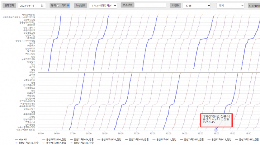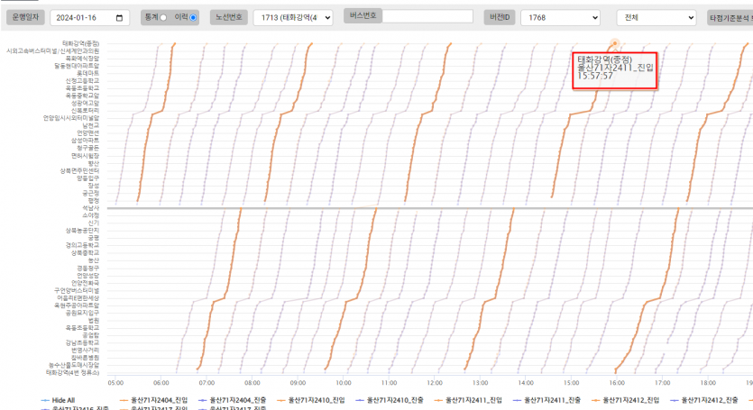 운행기록 확인 결과 2411호 차량이 태화강역 차고지에 15:57 경 도착하여 화장실도 들르지 못하고 바로 출발한 것을 확인하였습니다.