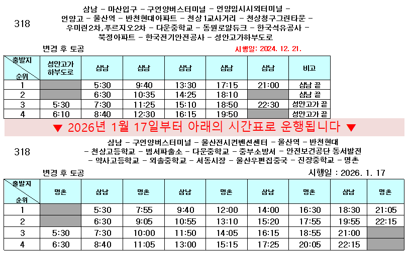 - 이전글2026년 1월 13일 울주13번이 차량 검사로 운행시간이 변경됩니다. 26.01.07