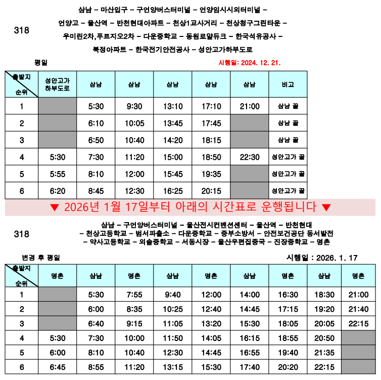 - 다음글2026년 1월 17일부터 318번, 514번, 518번, 725번 운행 경로가 변경됩니다. 26.01.07