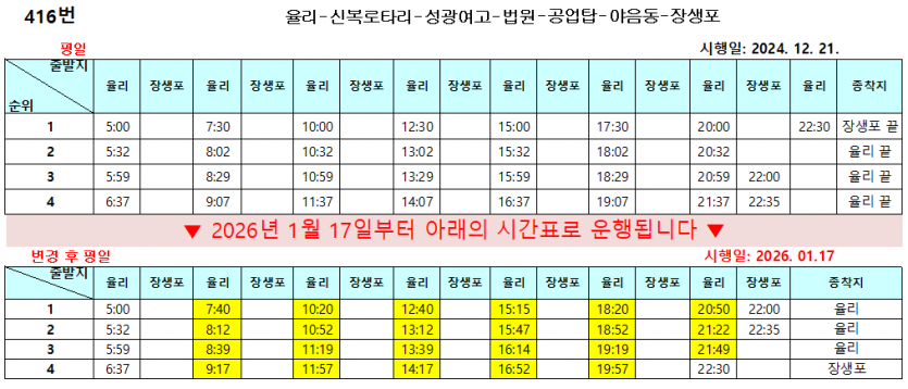 시간변경 2026년 1월 17일부터 134번, 318번, 416번, 713번, 918번, 1134번 운행 시간이 변경됩니다.