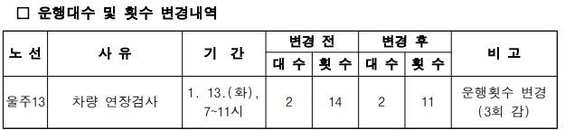 알림 2026년 1월 13일 울주13번이 차량 검사로 운행시간이 변경됩니다. 페이지 정보 작성자 최고관리자 (114.♡.215.204) 조회Hit 187회 작성일Date 26-01-07 14:35 본문 목록 다음글2026년 1월 17일부터 134번, 318번, 416번, 713번, 918번, 1134번 운행 시간이 변경됩니다. 26.01.07