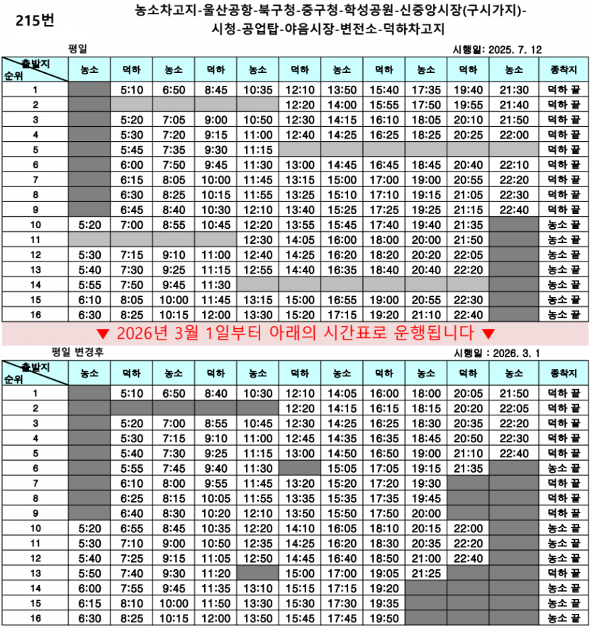 시간변경 2026년 3월 1일부터 215번, 462번 운행 시간이 변경됩니다.