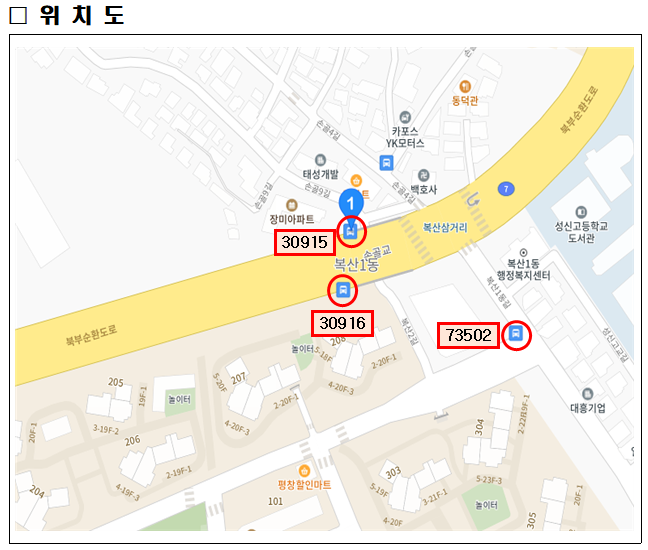 정류소 2023년 12월 30일부터 한국케이블공사앞 정류장과 복산1동행정복지센터앞 정류소 명칭이 변경됩니다.