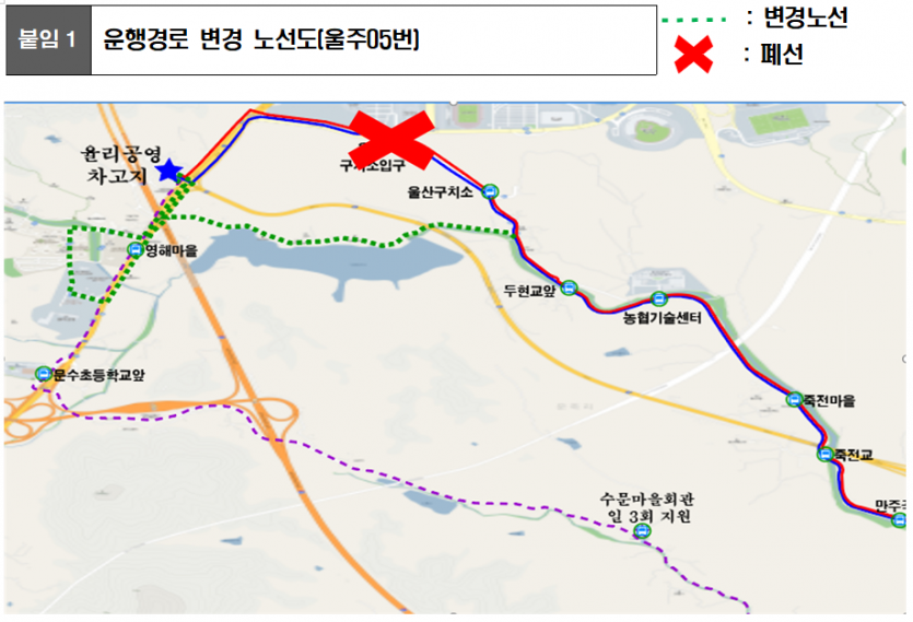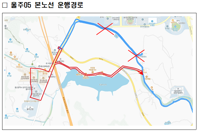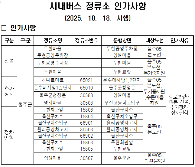 노선변경,신설,폐지 2025년 10월 18일부터 울주05번 운행 경로(종점)가 변경됩니다.