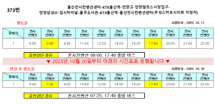 시간변경 2025년 10월 20일부터 373번 운행 시간이 변경됩니다.