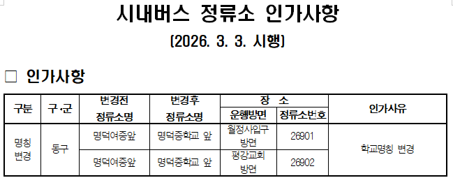 정류소 2026년 3월 3일부터 명덕여중앞 정류장이 명덕중학교앞 정류장으로 명칭변경됩니다.