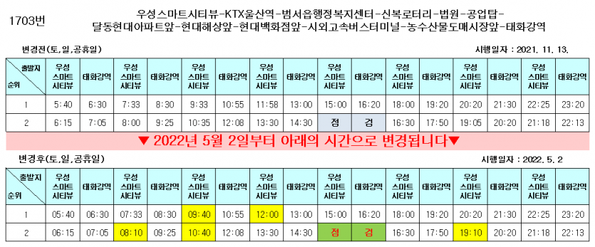 시간변경 2022년 5월 2일자로 1703번, 1733번 운행 시간이 변경됩니다.