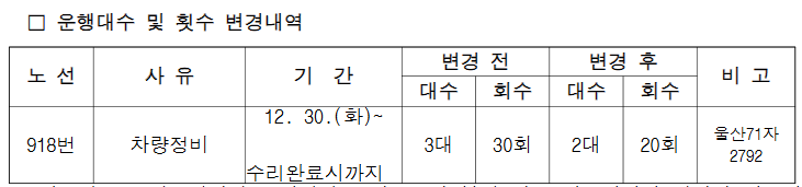 알림 2025년 12월 30일 ~ 수리 시까지 918번이 차량 수리로 운행시간이 변경됩니다.
