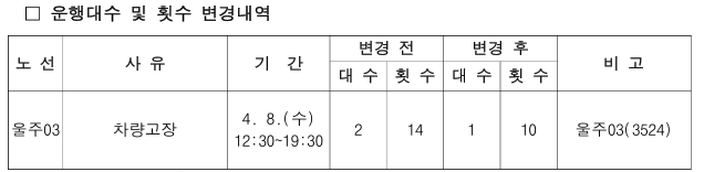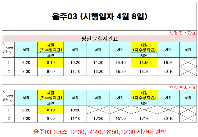 알림 2026년 4월 8일 12:30 ~ 19:30 동안 울주03번이 차량 고장으로 운행시간이 변경됩니다.