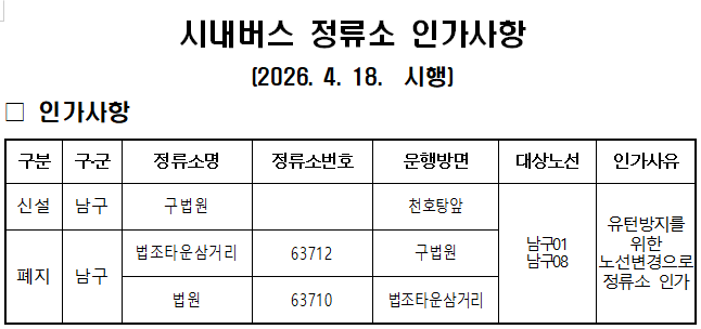 노선변경,신설,폐지 2026년 4월 18일부터 남구01, 남구08 운행 경로가 변경됩니다.