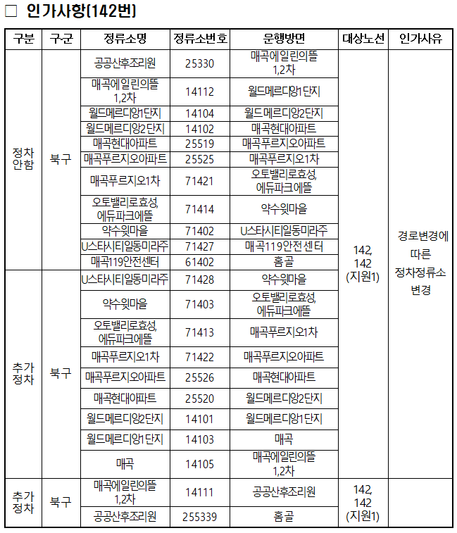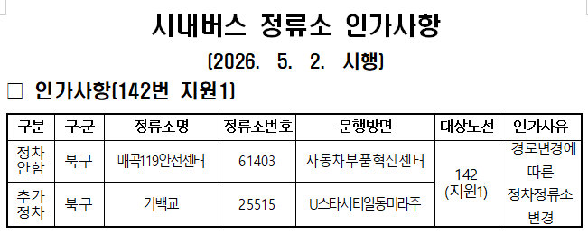 시간변경 2026년 5월 2일부터 142번 운행 경로가 변경됩니다.