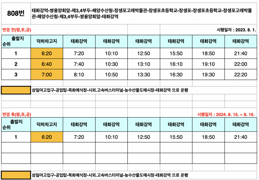 알림 2024년 8월 15일 ~ 8월 21일 동안 808번 차량 점검으로 인해 운행시간이 변경됩니다.