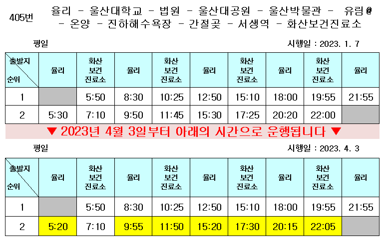 시간변경 2023년 4월 3일자로 358번, 405번 운행 시간이 변경됩니다.