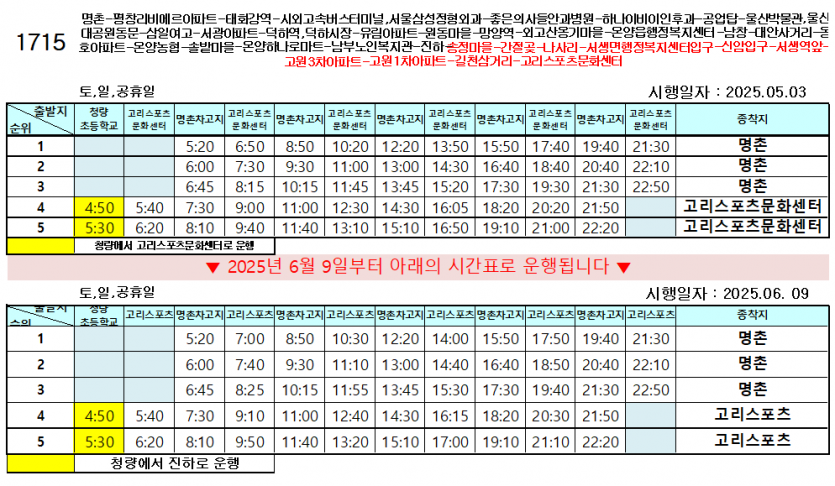 시간변경 2025년 6월 9일부터 1715번 운행시간이 변경됩니다.