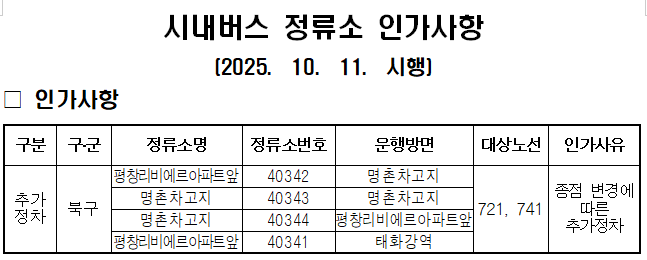 노선변경,신설,폐지 2025년 10월 11일부터 721번, 741번 운행 경로(종점)가 변경됩니다.