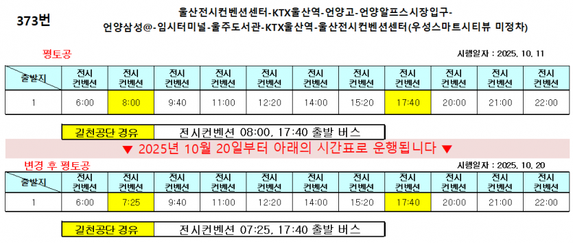 시간변경 2025년 10월 20일부터 373번 운행 시간이 변경됩니다.