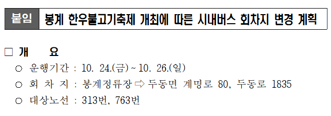 알림 2025년 10월 24일~26일 동안 봉계 한우불고기축제로 시내버스 회차지점이 임시로 변경됩니다.