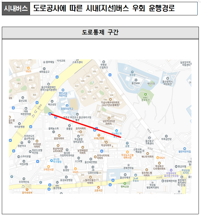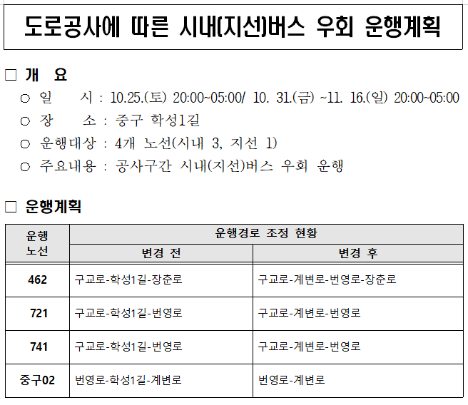 알림 2025년 10월 25일, 10월 31일 ~ 11월 16일(20:00~05:00) 동안 학성1길 도로공사로 시내버스가 우회 운…